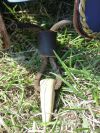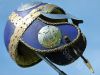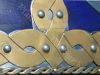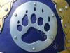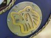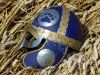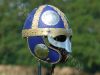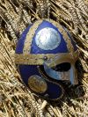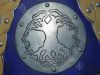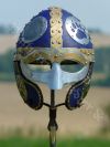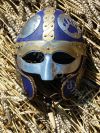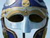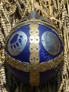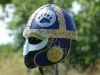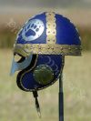 Der Helm wurde nach Vorstellung des Kunden gefertigt. Zentrales Thema sollte der Bär sein. Der Helm an sich sollte, obwohl für den Larpeinsatz gedacht, eine gute Schutzwirkung aufweisen. Daher war die Vorgabe ein Brillenhelm mit Wangenklappen. Als Zier sollte neben den Bärenelementen ein einfaches Knotenmuster in Messing dienen, welches den Bändern des Helmes folgt. Das Messing wurde gealtert. Die Bärenelemente (Köpfe und Tatze) sowie der Lebensbaum wurden als scheibenförmige Applikationen aufgenietet. Für einen besseren Kontrast und edlere Optik wurden die Bärenköpfe auf den Wangenklappen mit Messing hinterlegt. Um dem Helm weiteren Charakter zu verleihen wurde nach historischem Vorbild Messingbrauen appliziert. Die Helmkanten wurden zum Schutz mit einer zusätzlichen Messingzierleiste eingefasst. Der Helm besitzt einen einfachen Zugverschluss mit "Bärenzahn" in der Schinge ;-) |