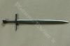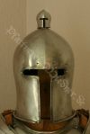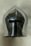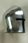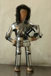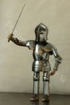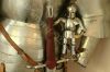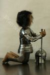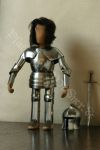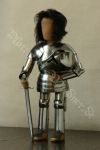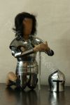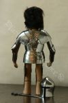 Die Rüstung ist an einen italieniscen Quattrocento Harnisch angelehnt, hat allerdings deutsches Armzeug. Die Barbuta ist aus einem Stück geschlagen. Die asymmetrischen Schultern bestehen aus einem Geschübe. Der Brust- und Rückenpanzer bestehen je aus zwei Teilen, welche vernietet sind. Die obere Rückenplatte besitzt Abstufungen, die die Schiftung des Oberrückens immitieren. Die Harnischbrust hat vier Folgen, der Harnischrücken drei. Die Beine sind mit der Kniekachel gelenkig verbunden. An den Waden sind Ringpanzerflecken zum Schutz der Füsse angebracht. Die Puppe ist ca. 30 cm gross. |